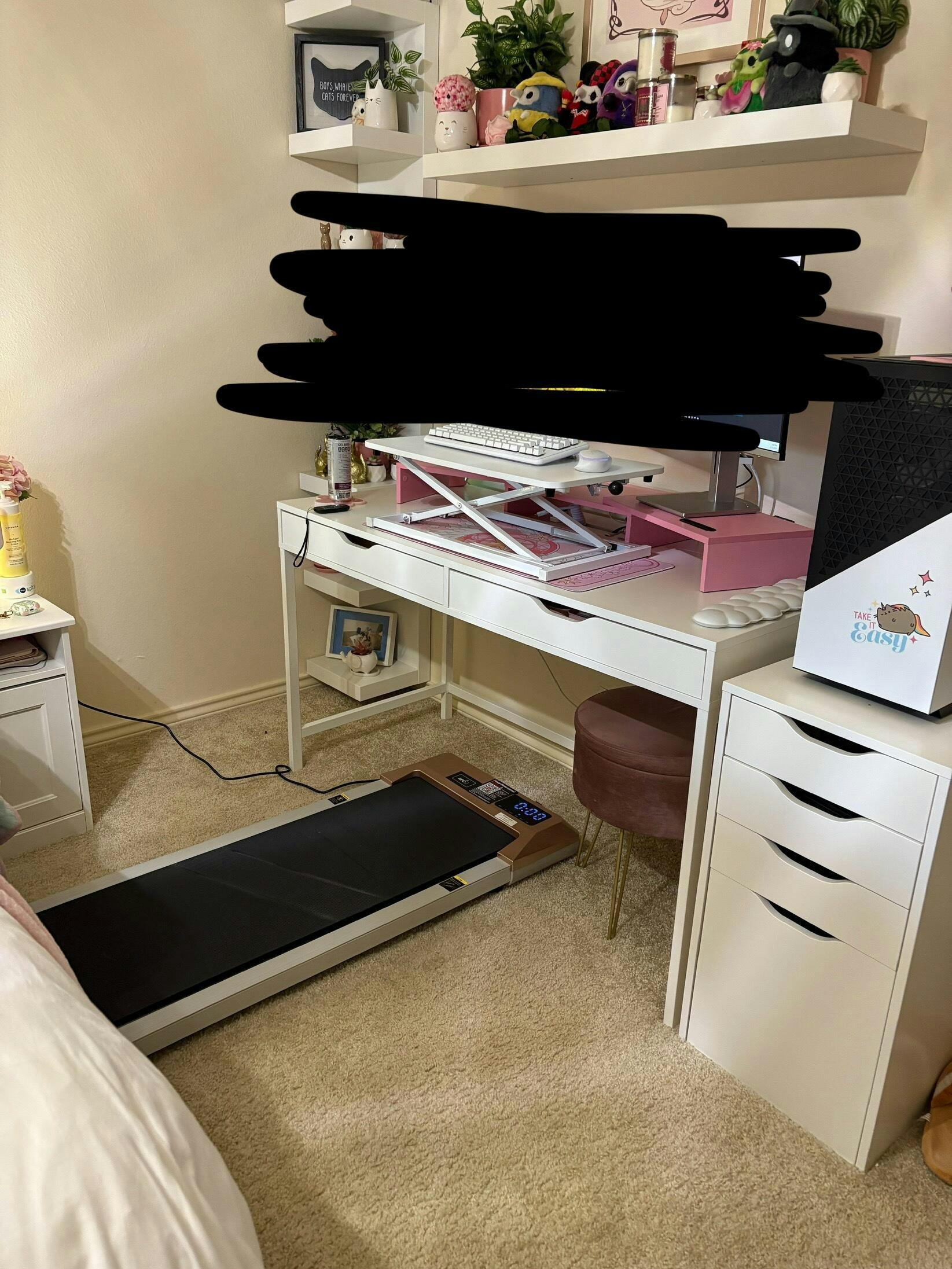 Perfect for my at home work area! It runs just fine on apartment carpet. I bought the mat to go under it but have yet to need it. I haven’t really used the phone app that comes with it, I just use the remote controller to stop or increase the speed. It is a little heavy but slides under my bed just fine. The pink is also a great color! I’m extremely happy I bought it!